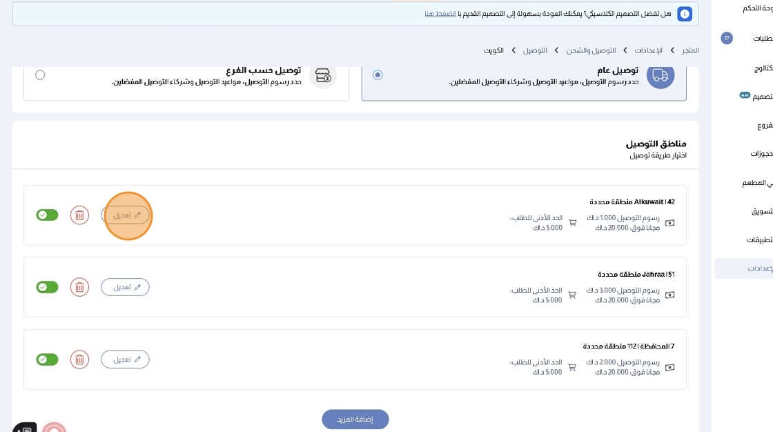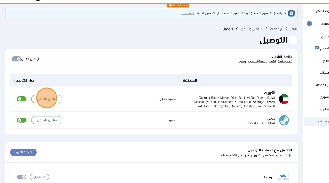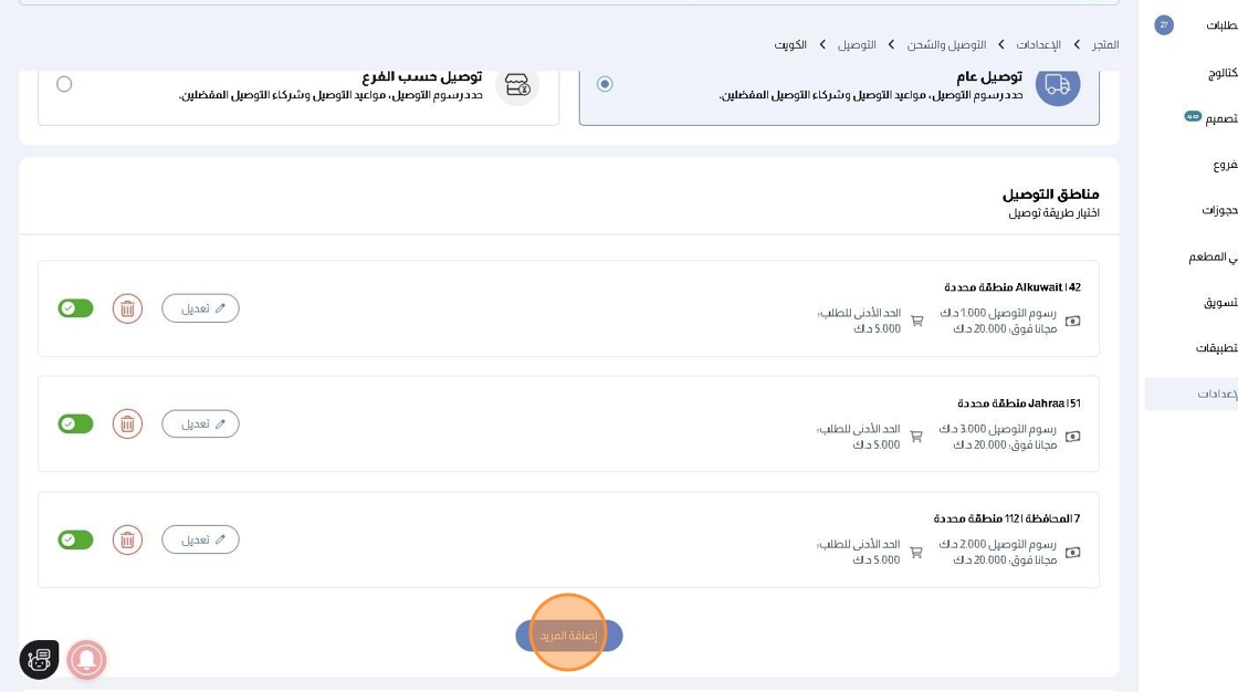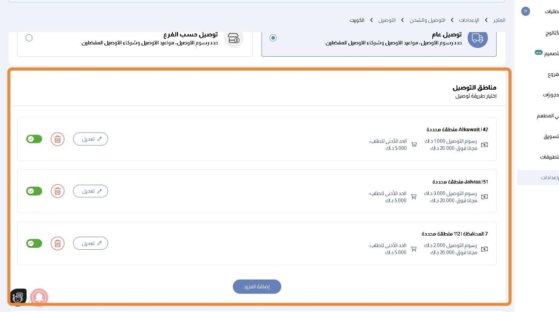 13. إذا قمت بإضافة منطقة جديدة, تأكد من تفعيل خيارات التوصيل لتلك المنطقة