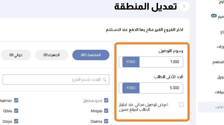 9. في اعدادات تعديل المنطقة يمكنك إضافة رسوم التوصيل والحد الأدنى للطلب لتلك المنطقة