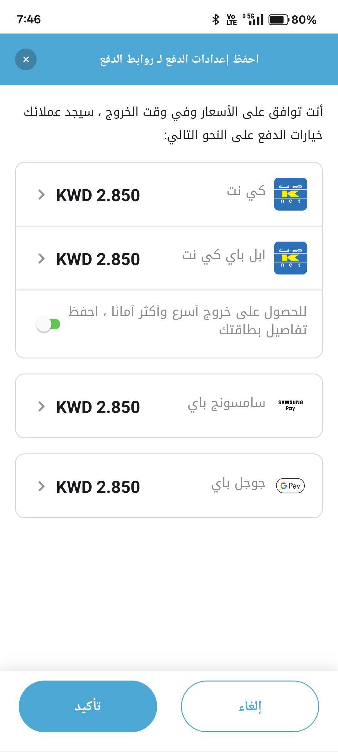 5. ستظهر نافذة لعرض وتأكيد طرق الدفع التي قمت بتفعيلها ويمكنك تأكيد أو إلغاء تلك الإعدادات