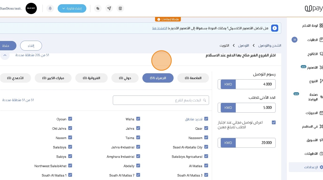 14. قم بتفعيل مناطق التوصيل التي قمت بإعدادها لهذا الفرع
