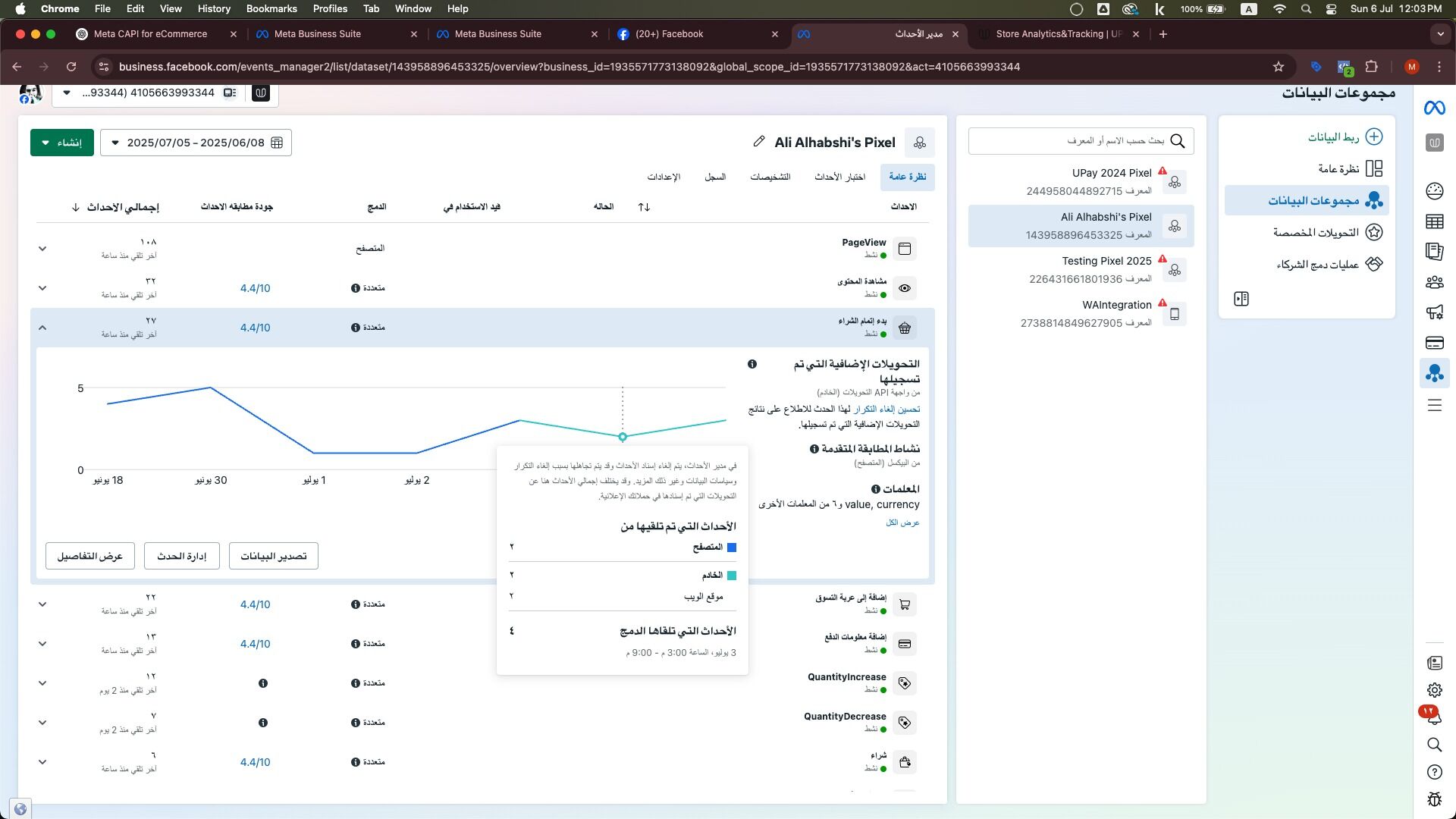 13. بعد عملية الربط، قم باستخدام متجرك والقيام باحداث مختلفة (إضافة للعربة، التوجه لصفحة الدفع...) وانتظر من ساعة إلى ساعتين ثم ادخل إلى حسابك في Meta Business Manager - مدير أعمال ميتا