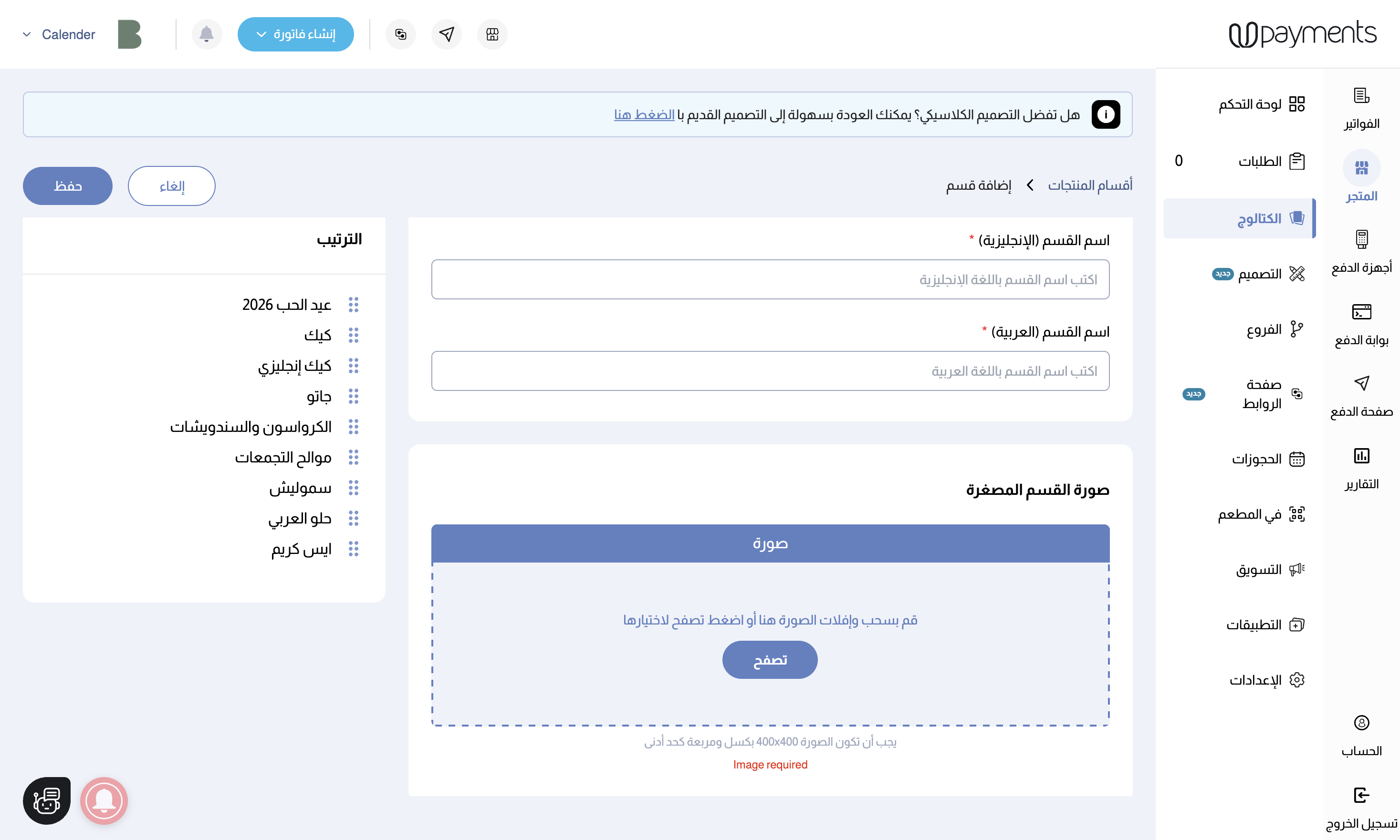 أنشئ كل قسم من خلال إدخال اسم القسم باللغة العربية والإنجليزية ورفع سورة القسم