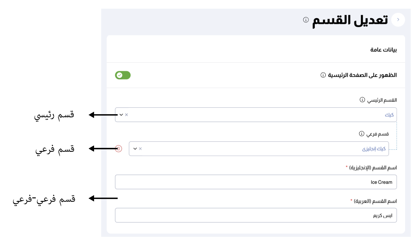 - الخطوة 3: لكل قسم فرعي-فرعي، قم بتعديل القسم وإختيار "القسم الرئيسي"من القائمة المنسدلة ثم اضغط على زر "+ إضافة قسم فرعي" واختر القسم-الفرعي