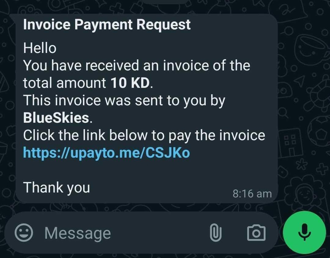 37. If you have entered the Mobile Number and choose to send the invoice, your customer will receive a Whatsapp message with the payment request and invoice