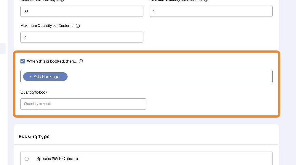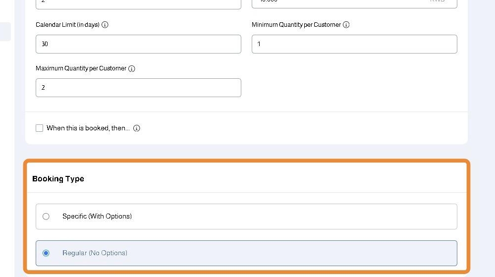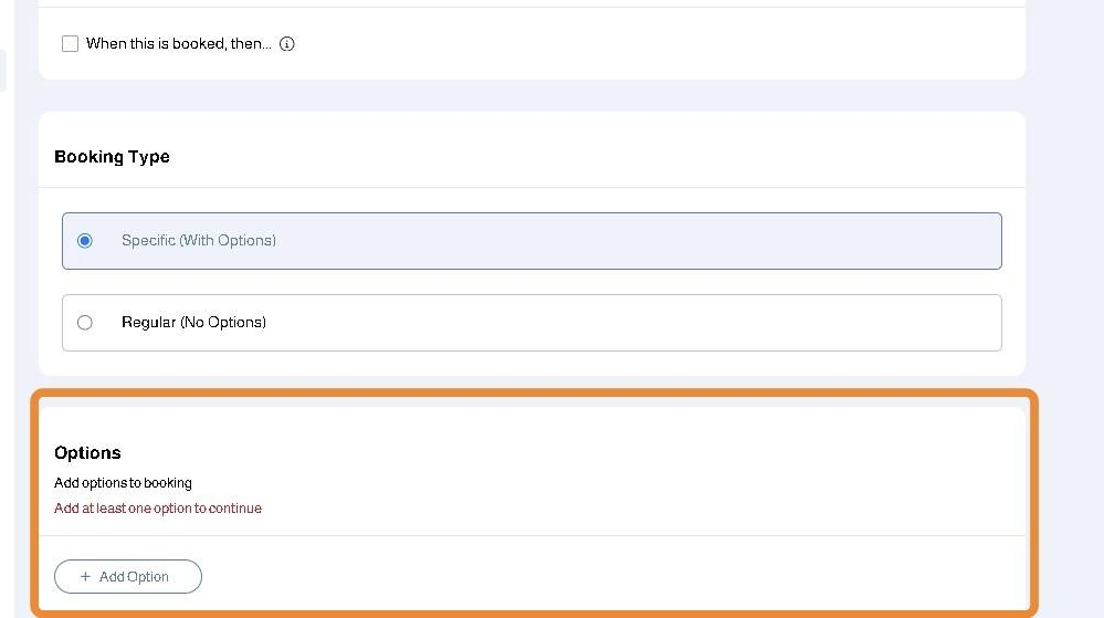 15. If you choose Specific Booking Type, you will be able to add the options for the booking by clicking + Add Option