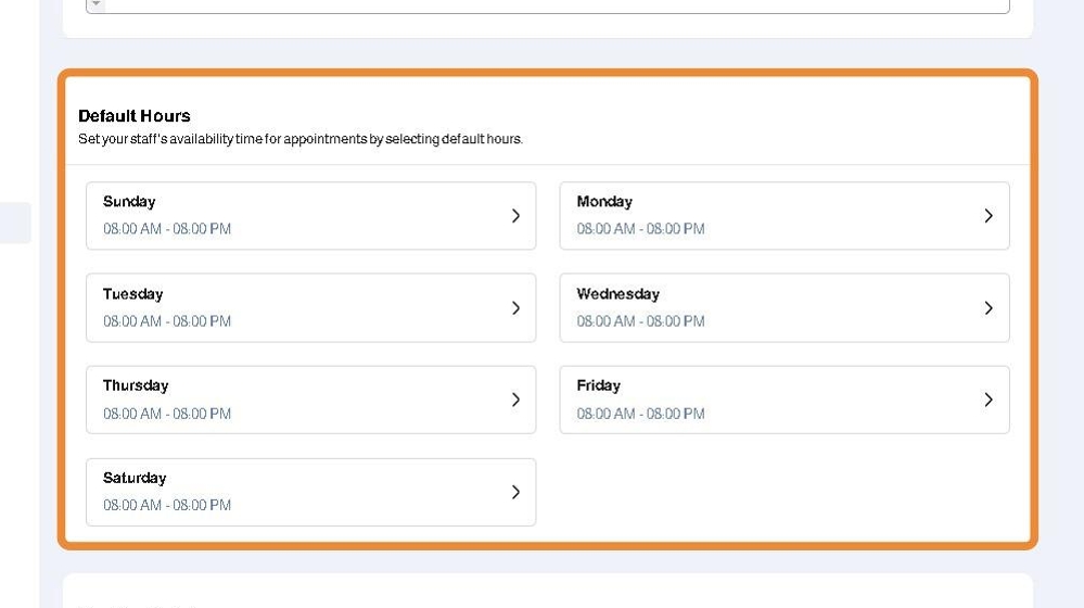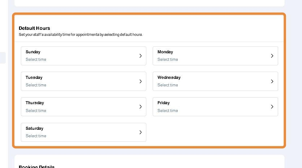 8. Enter the Booking Default Hours by clicking each day to setup its working hours