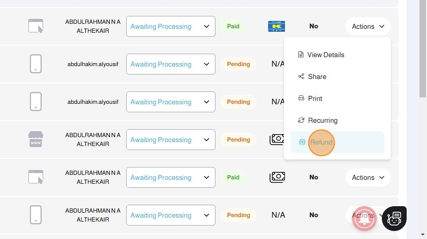 2. The sub-user will choose the invoice to be refunded --> Click the Three Dots Settings Dropdown and choose Refund