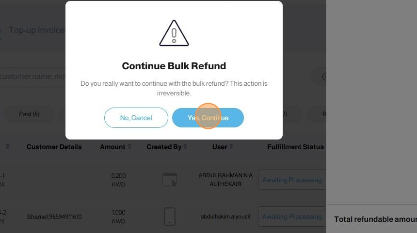 9. Click Yes, Continue on the confirmation popup to proceed with the refund
