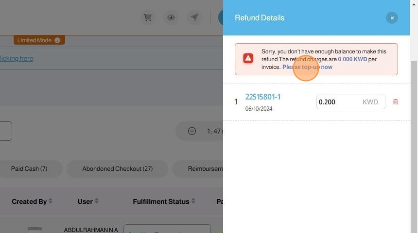 4. If you do not have the required balance to complete the refund, you will be required to top-up your balance first. Click Please top-up now