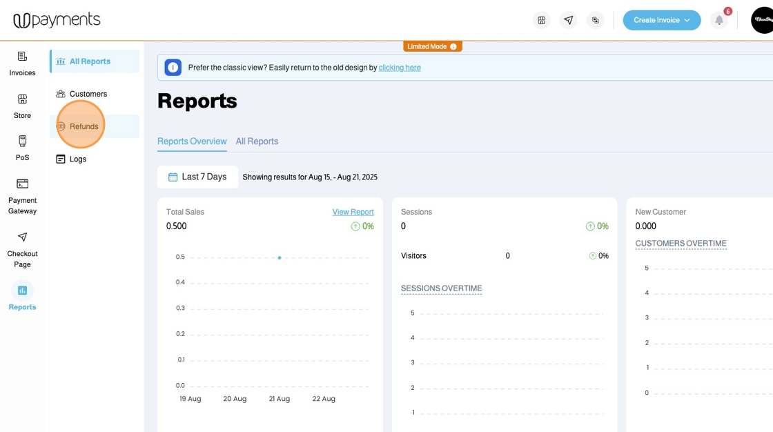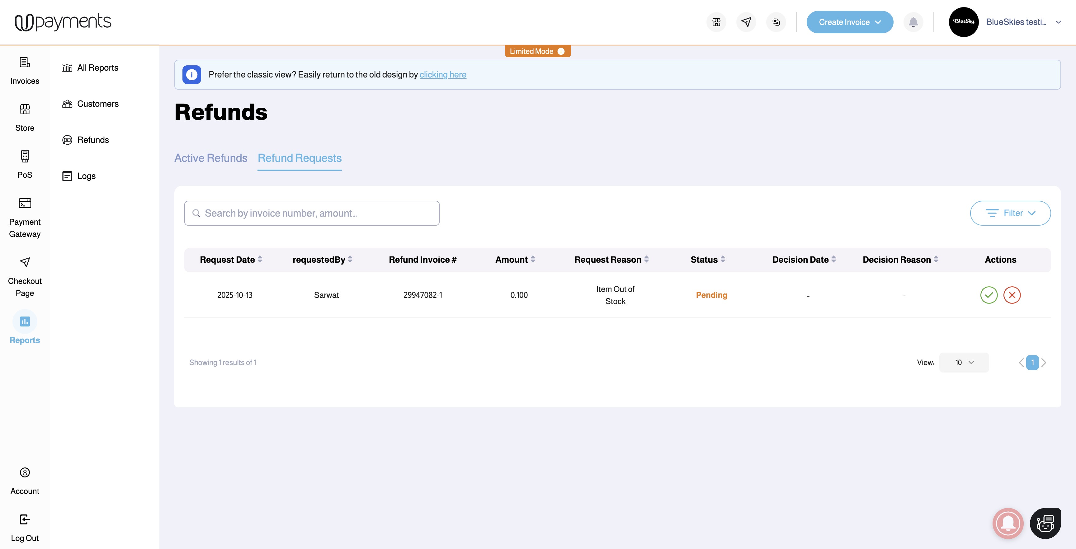 NOTE: If you allowed your sub-user to access reports from their account permissions, they will be able to view their initiated refund requests status by navigating to Reports --> My Refund Requests