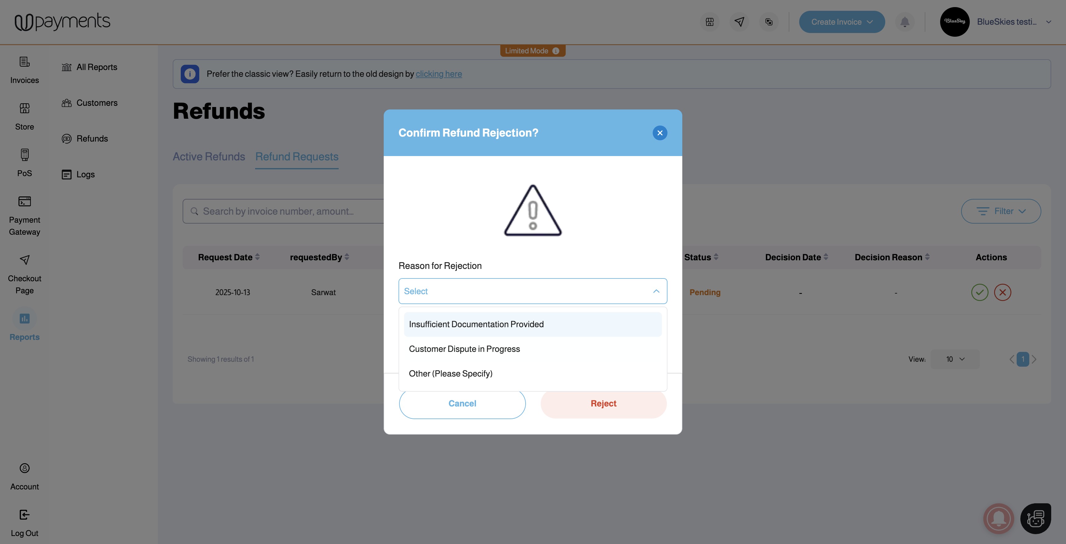5. If the Admin rejects the refund, they will be prompted to confirm refund rejection and choose the reason for rejection