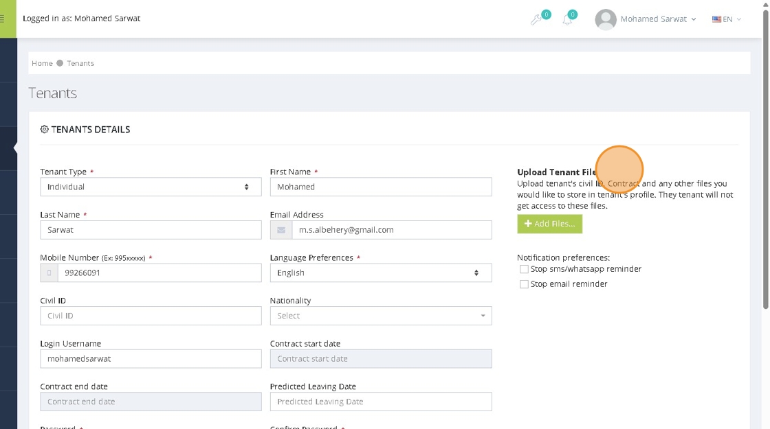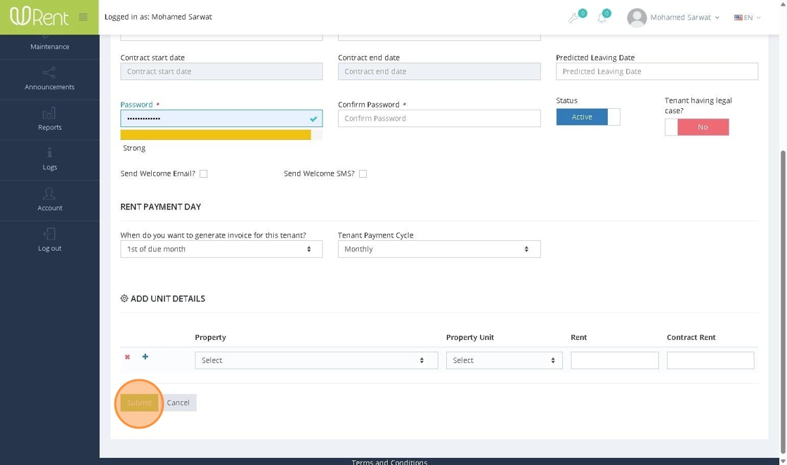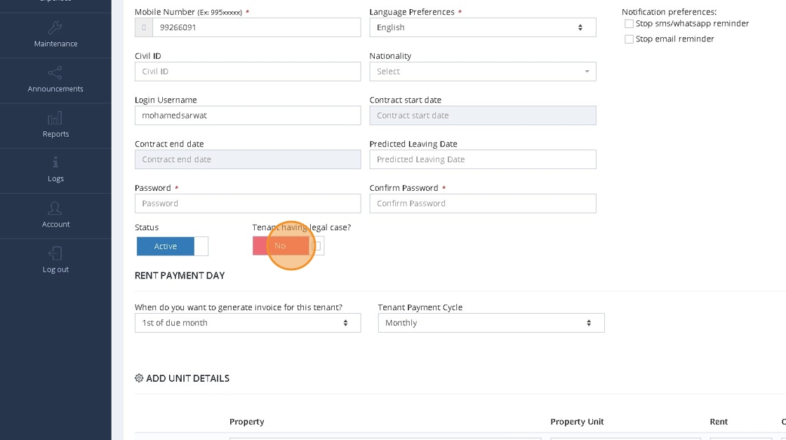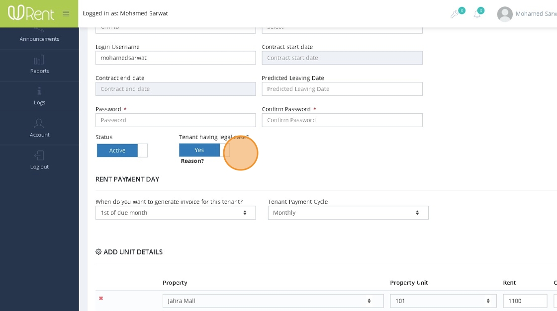 14. If the tenant has a legal case, toggle the option Tenant having legal case?