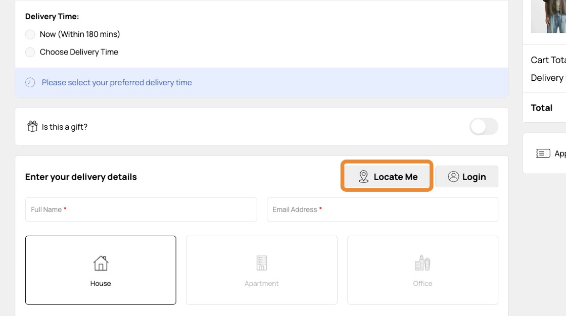 1. In the Checkout Page, your customers can utilize the Locate Me feature to pinpoint their exact location on a map