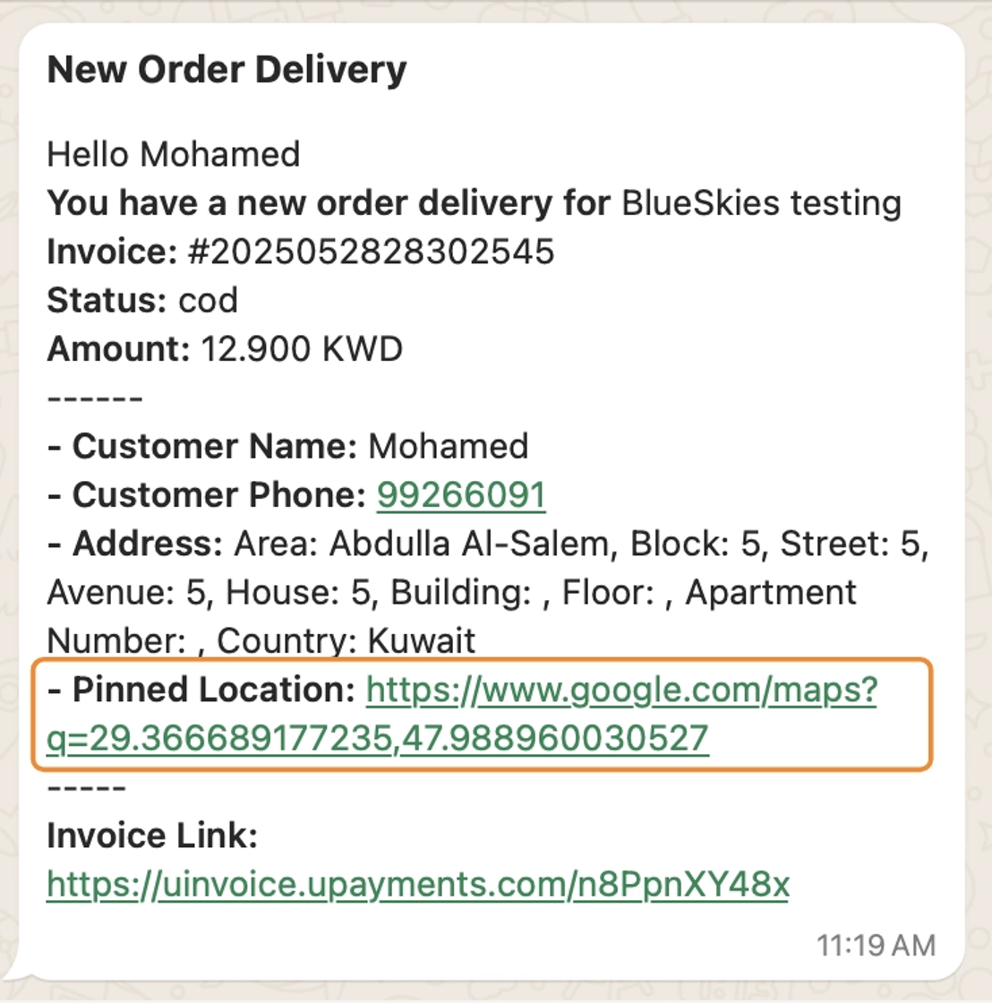 8. The driver will receive the order details via Whatsapp with the Pinned Location link to open it on Google Maps