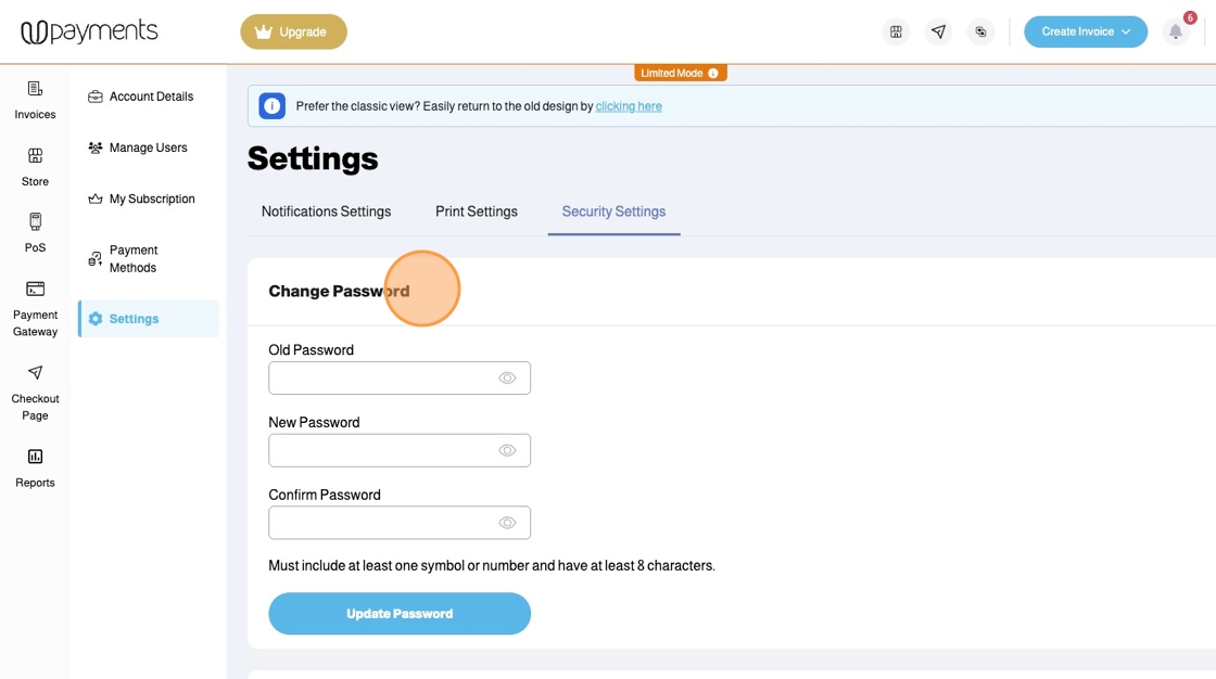 9. You can change your password under the Change Password section by entering the Old Password and Entering the New Password