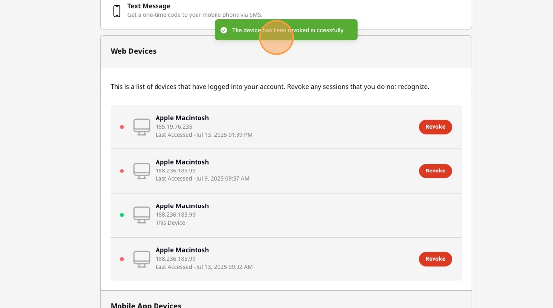14. You can view all authenticated Web Devices under the Web Devices section. For each device, you can view the Device Name, IP Address and Last Access Date and Time